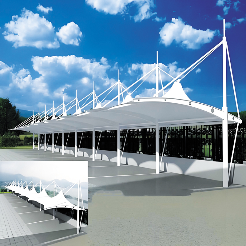膜材选择:根据停车棚的使用环境、预算和设计要求选择合适的膜材。常用的膜材有聚酯纤维(PET)织物加聚偏氟乙烯(PVDF)涂层的材料,这种膜材具有高强度、良好的透光性、抗紫外线和自洁性等特点。要注意检查膜材的质量,包括厚度、强度、色泽等指标是否符合要求。